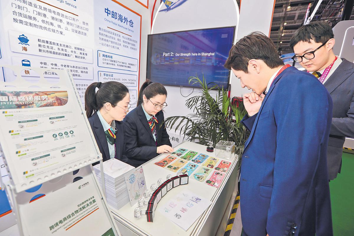 11月5日—10日,第八屆中國國際進(jìn)口博覽會(以下簡稱“進(jìn)博會”)在上海舉行。本屆進(jìn)博會有155個國家、地區(qū)和國際組織參與,4108家境外企業(yè)參展,規(guī)模再創(chuàng)新高。上海市郵政分公司特為本屆進(jìn)博會啟用并發(fā)行了《第八屆中國國際進(jìn)口博覽會》YFM118E型郵資機(jī)戳和紀(jì)念封各1枚,受到廣大集郵愛好者和參展觀眾的歡迎。同時,中國郵政EMS連續(xù)第八年受邀參展,展示了其全球寄遞網(wǎng)絡(luò)、境外倉配矩陣等六大板塊成果,呈現(xiàn)郵政從“郵商并舉”向“郵商貨倉并進(jìn)”的轉(zhuǎn)型路徑,為跨境貿(mào)易提供全鏈條解決方案。圖為觀眾被EMS展位上的特色明信片所吸引。