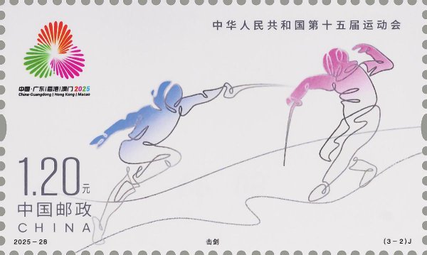 中國郵政定于11月9日發(fā)行《中華人民共和國第十五屆運(yùn)動(dòng)會(huì)》紀(jì)念郵票1套3枚,郵票圖案名稱分別為花樣游泳、擊劍、乒乓球。全套郵票面值3.60元,計(jì)劃發(fā)行數(shù)量為套票500萬套、版式二69.3萬版。