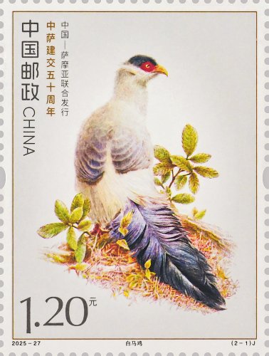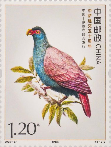 本套郵票以?xún)蓢?guó)的特色鳥(niǎo)類(lèi)為核心設(shè)計(jì)元素,融西方鋼筆線(xiàn)條與東方淡彩的表現(xiàn)技法,筆觸細(xì)膩傳神,形象生動(dòng)逼真,兩只禽鳥(niǎo)顧盼相應(yīng)、神氣貫連,洋溢著蓬勃的生命力。本套郵票既展現(xiàn)兩國(guó)獨(dú)特的自然生態(tài)之美,更傳遞出兩國(guó)友誼的深厚底蘊(yùn)與美好未來(lái)。第一枚郵票表現(xiàn)了白馬雞。作為四川丹巴莫斯卡鳥(niǎo)類(lèi)重要棲息地的主要保護(hù)物種,白馬雞也成為丹巴自然生態(tài)的鮮活代表,當(dāng)?shù)鬲?dú)特的高原氣候、適宜的生態(tài)環(huán)境為其提供了理想生存空間。第二枚郵票表現(xiàn)了齒嘴鳩。作為薩摩亞的本土特有鳥(niǎo)類(lèi),齒嘴鳩不僅是當(dāng)?shù)厣鷳B(tài)系統(tǒng)的重要成員,更被視為薩摩亞自然與文化遺產(chǎn)的象征,承載著薩摩亞人民對(duì)家鄉(xiāng)土地的熱愛(ài)與珍視。