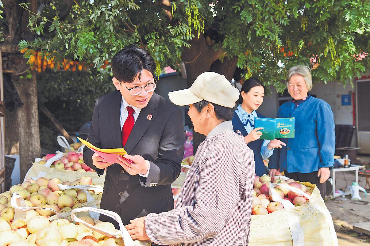 10月21日,沂源縣人民法院四級法官助理黃旭東和郵政工作人員一起在北店子村向果農(nóng)宣講法律知識。