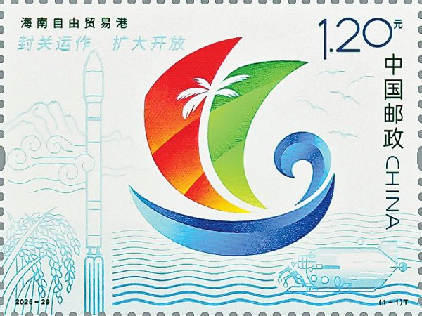 12月18日,海南自由貿(mào)易港將正式啟動全島封關(guān)運(yùn)作。這一重大舉措,標(biāo)志著中國對外開放進(jìn)入全新階段,對于加快吸引全球優(yōu)質(zhì)要素集聚、促進(jìn)海南自貿(mào)港高質(zhì)量發(fā)展具有重要意義。郵票畫面以海南自由貿(mào)易港形象標(biāo)識為主體,左上角表現(xiàn)了“封關(guān)運(yùn)作 擴(kuò)大開放”宣傳語;畫面背景繪有五指山、稻穗、火箭、深海勇士號載人潛水器、數(shù)據(jù)傳輸(無色熒光)等元素,展現(xiàn)出“五向圖強(qiáng)”高質(zhì)量發(fā)展新圖景,寓意海南自貿(mào)港向著加快建設(shè)具有世界影響力的中國特色自由貿(mào)易港目標(biāo)奮勇前進(jìn)。