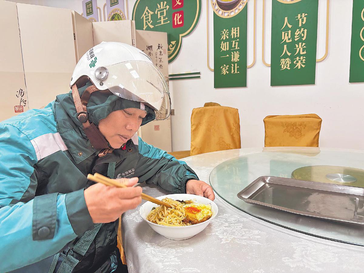 趕著投遞的攬投員在回班間隙,吃上了暖胃又暖心的熱面條?!跞娇 z