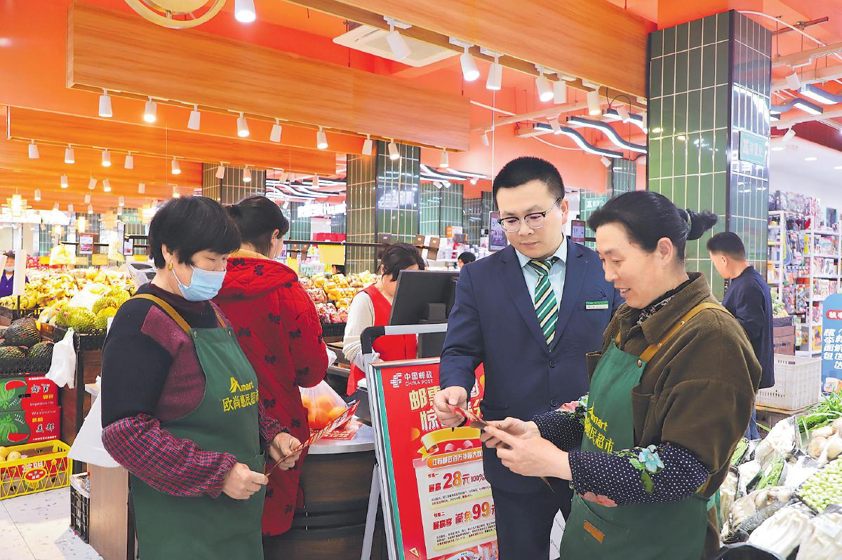 郵政工作人員在客流量大的超市現(xiàn)場(chǎng)提供產(chǎn)品咨詢與投保服務(wù)。