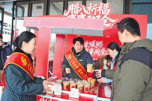 1月26日,江蘇省射陽縣郵政分公司聯(lián)合共建單位——中聯(lián)社區(qū)、吾悅廣場置業(yè)公司,在吾悅廣場開展“臘八祈福,事事粥全”活動,免費向快遞小哥、出租車駕駛員、環(huán)衛(wèi)工作者等500多名群眾送上可口的臘八粥和面巾紙,并向他們送上節(jié)日祝福,讓節(jié)日的溫暖在街頭巷尾流淌。