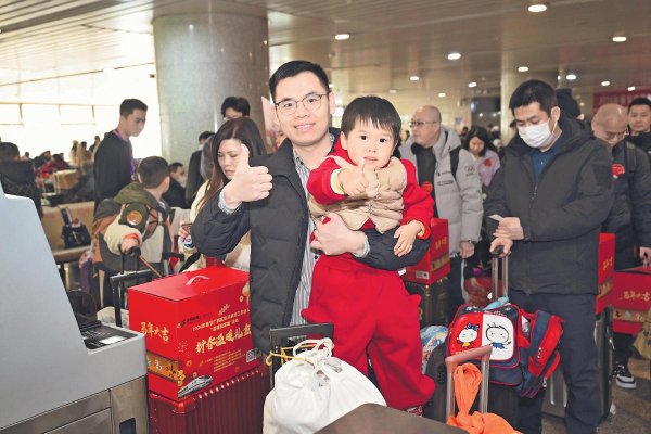 2月10日,廣西壯族自治區(qū)郵政分公司在北京西站參與舉辦廣西在京津冀務(wù)工創(chuàng)業(yè)人員“溫暖回家”活動,并送上新春禮包,贏得老鄉(xiāng)父子點(diǎn)贊?! 踮w明震 攝