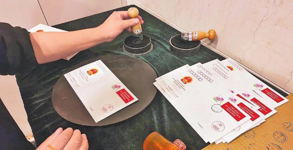 3月5日,郵政工作人員為全國兩會(huì)紀(jì)念封加蓋紀(jì)念戳。一枚枚紀(jì)念封,用郵政語言記錄兩會(huì)時(shí)刻。
