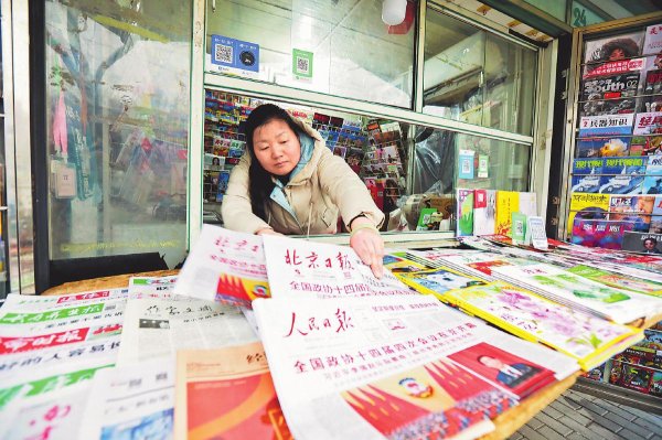 3月5日,北京西城區(qū)廣安門外大街報(bào)刊亭,工作人員整理“兩會(huì)專架”,確??d兩會(huì)報(bào)道的黨報(bào)及時(shí)與市民見面。