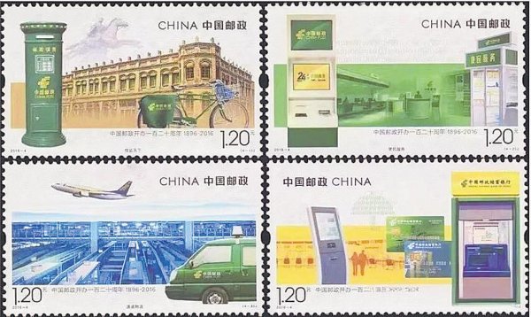 2016年3月20日,中國(guó)郵政發(fā)行《中國(guó)郵政開辦一百二十周年》紀(jì)念郵票1套4枚(圖4),展現(xiàn)了中國(guó)郵政的悠久歷史及現(xiàn)代化發(fā)展。第1枚郵票“信達(dá)天下”選用清代郵政天津局舊址、古代驛使雕塑、郵政自行車、郵筒等元素,展現(xiàn)了中國(guó)郵政120年的歷史畫卷,傳遞了中國(guó)郵政“信達(dá)天下”的歷史使命。第2枚郵票“便民服務(wù)”選用郵政服務(wù)大廳、便民服務(wù)站、易郵柜等元素,表現(xiàn)了中國(guó)郵政努力踐行“便民服務(wù)”的理念。第3枚郵票“速遞物流”選用現(xiàn)代化速遞物流集散中心、郵運(yùn)汽車、飛機(jī)等元素,凸顯中國(guó)郵政速遞物流方便快捷、安全可靠的優(yōu)勢(shì)。第4枚郵票“普惠金融”選用郵政儲(chǔ)蓄銀行營(yíng)業(yè)廳、ATM機(jī)、郵政銀行卡(借記卡和信用卡)、中郵保險(xiǎn)形象等元素,傳達(dá)“進(jìn)步與您同步”的服務(wù)理念,凸顯“普惠金融”的行業(yè)使命。為配合相關(guān)紀(jì)念活動(dòng),中國(guó)郵政還利用當(dāng)年發(fā)行的《年年有余》和《喜臨門》賀年專用郵票,印制《中國(guó)郵政開辦一百二十周年紀(jì)念》小全張1枚(圖5)。