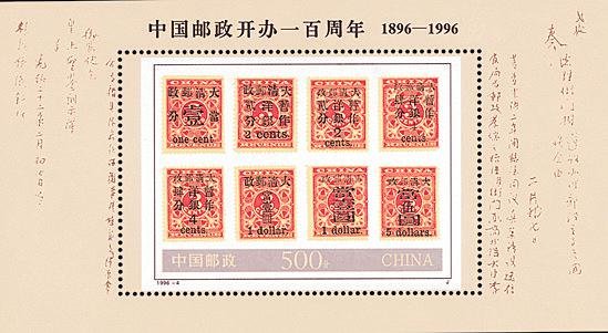 1996年3月20日,中國(guó)郵政發(fā)行《中國(guó)郵政開辦一百周年》紀(jì)念郵票1套4枚、小型張1枚。4枚郵票(圖1)選用清代天津郵政津局舊址、北京郵務(wù)管理局舊址、中華蘇維埃共和國(guó)郵政總局舊址、北京郵政樞紐4座不同時(shí)期的郵政建筑為主圖,回顧了百年郵政的滄桑,烘托了主題。4座郵政建筑風(fēng)格迥異,既有民居樣式,又有現(xiàn)代化建筑,為了在形式上進(jìn)行統(tǒng)一,設(shè)計(jì)者根據(jù)建筑外觀的特點(diǎn),在橫形票幅的基礎(chǔ)上,上下各加一條灰邊,圖案上方的灰邊上印有郵票圖名和徽記,下方的灰邊擺放國(guó)銘、面值、郵票志號(hào)等。郵票畫面視角開闊,猶如一幅完整的建筑畫長(zhǎng)卷,體現(xiàn)了韻律美。每枚郵票右上角的郵電徽志與左下角的綠色面值相呼應(yīng),強(qiáng)調(diào)了郵資憑證的屬性。小型張(圖2)郵票以分兩行排列的全套8枚清紅印花加蓋郵票為主圖,邊飾則展示了1896年3月20日清總理衙門議辦郵政折及光緒皇帝的“依議欽此”御批。紅印花加蓋郵票是清代國(guó)家郵政開辦后發(fā)行的第一套郵票,也是世界珍郵,用它作為小型張郵票主圖,不僅點(diǎn)明了中國(guó)郵政開辦百年的紀(jì)念主題,也展示了中國(guó)珍郵的風(fēng)采。