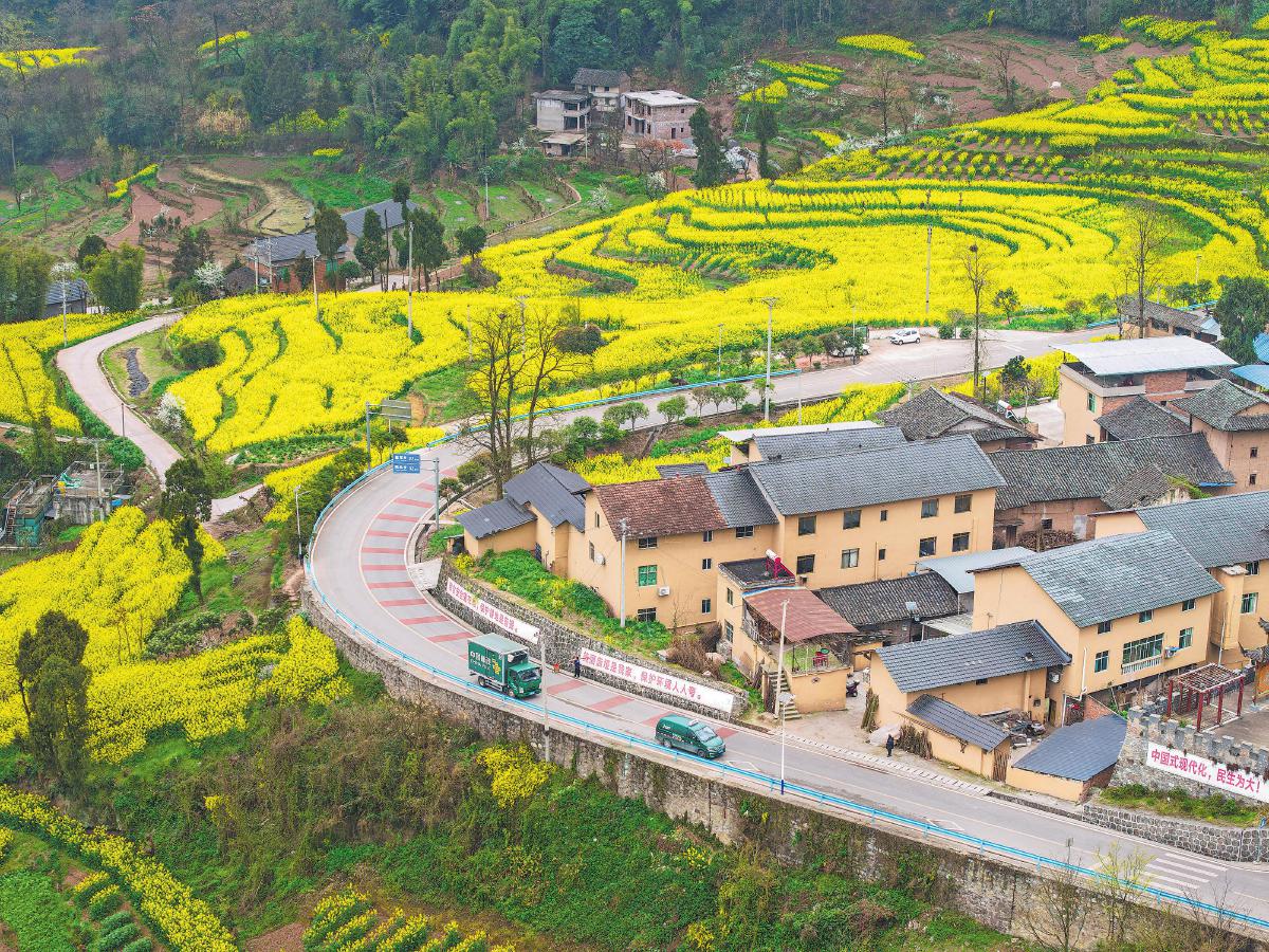 3月13日,巴渝梯田鋪金浪,郵車(chē)穿行其間,將春耕物資送往武隆區(qū)廟埡鄉(xiāng),為農(nóng)戶(hù)穩(wěn)產(chǎn)增收注入郵政力量。 □王金莊 攝