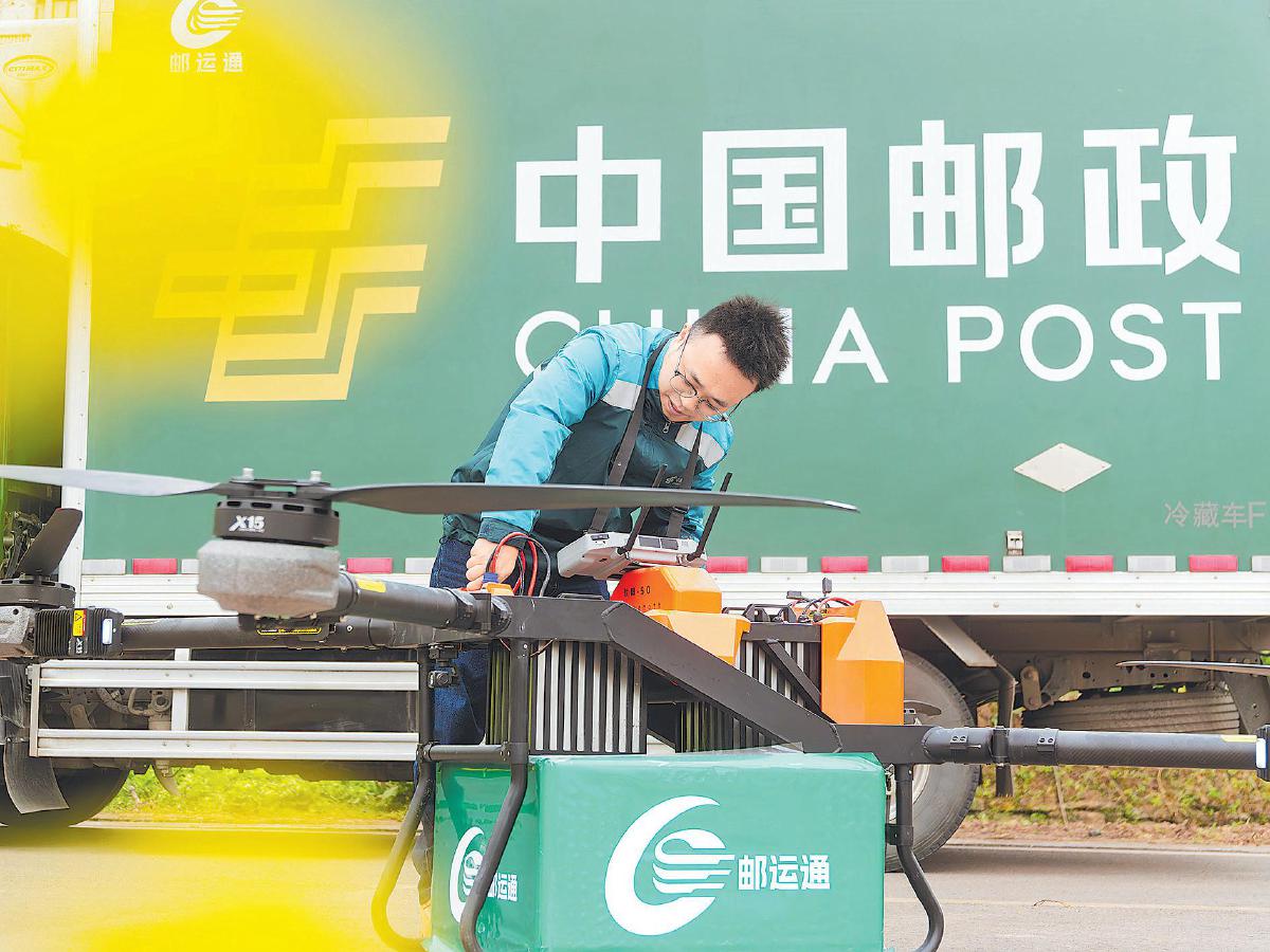 3月13日,重慶郵政飛控員在檢查無(wú)人機(jī),保障農(nóng)資精準(zhǔn)送達(dá)田間地頭?! 跬踅鹎f 攝