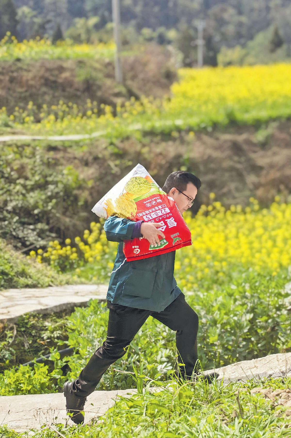 3月11日,郵政投遞員奔走在田埂間,搶農(nóng)時(shí)、保春耕,將農(nóng)資及時(shí)送到農(nóng)戶(hù)手中?! 跷很啊z